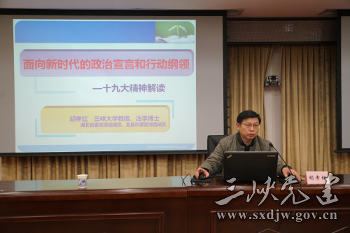 市委宣讲团成员、三峡大学马克思主义学院党委书记、院长胡孝红以《面向新时代的政治宣言和行动纲领》为题,围绕过去五年的历史性成就和历史性变革、中国特色社会主义进入新时代、两个一百年奋斗目标的战略部署、我国经济社会发展重大战略部署、坚定不移推进全面从严治党等方面,深入阐释十九大精神。
